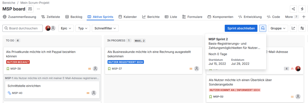 - Backlog mit ersten User Storys erstellen und priorisieren (digital z.B. mit Atlassian Jira, Azure DevOps oder anderen Tools – gerne auch auf Zetteln an einem Whiteboard)